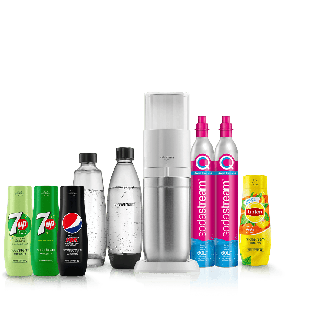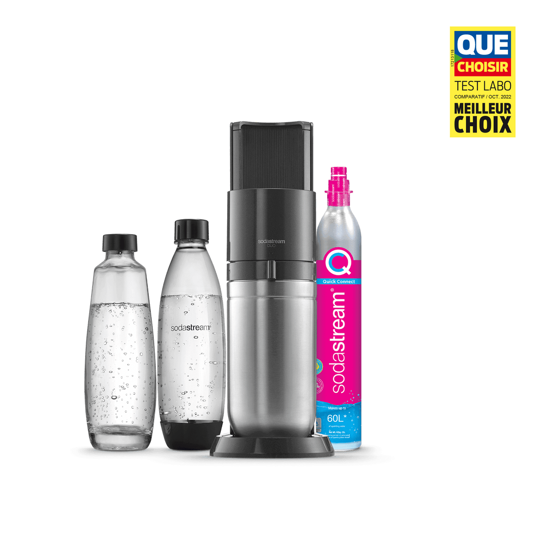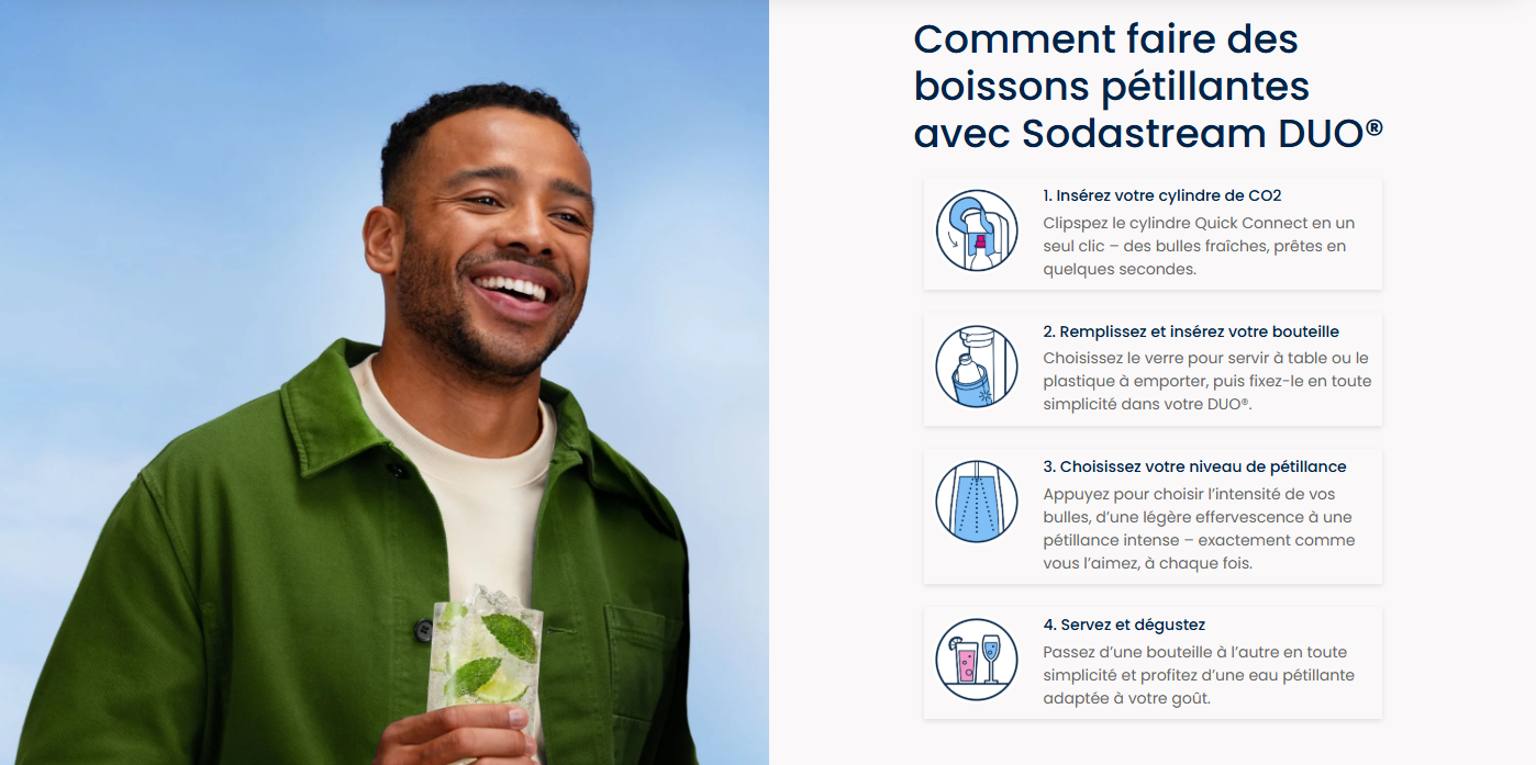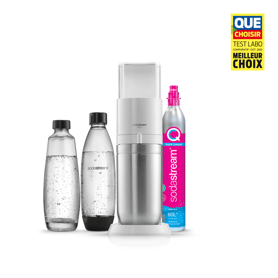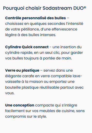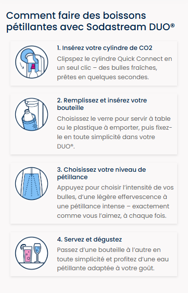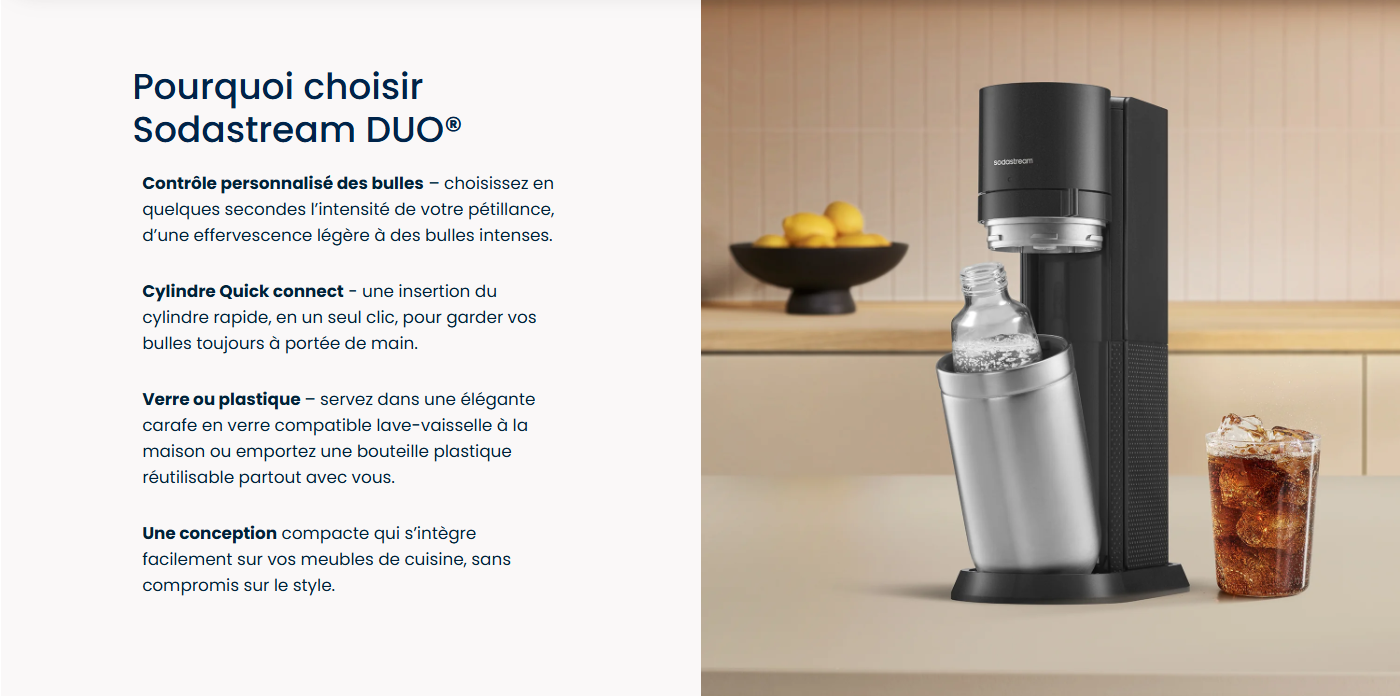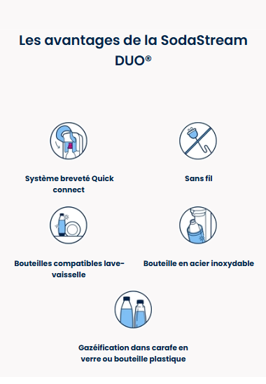 Vous ne pouvez utiliser la recharge de gaz Quick Connect de SodaStream qu’avec la machine à gazéifier SodaStream DUO™. Les recharges de gaz à système de vissage ne sont pas compatibles avec la machine SodaStream DUO.