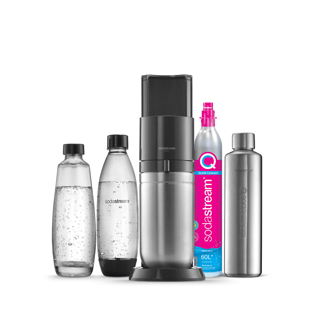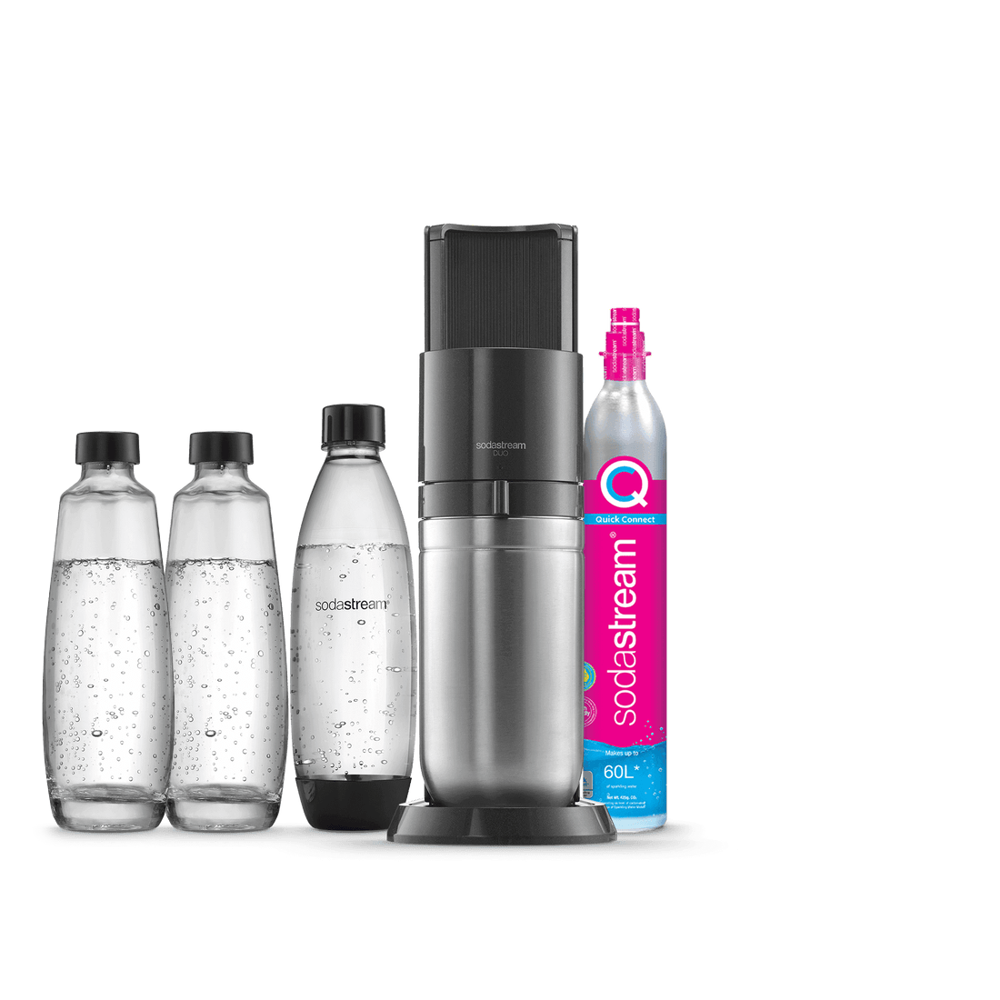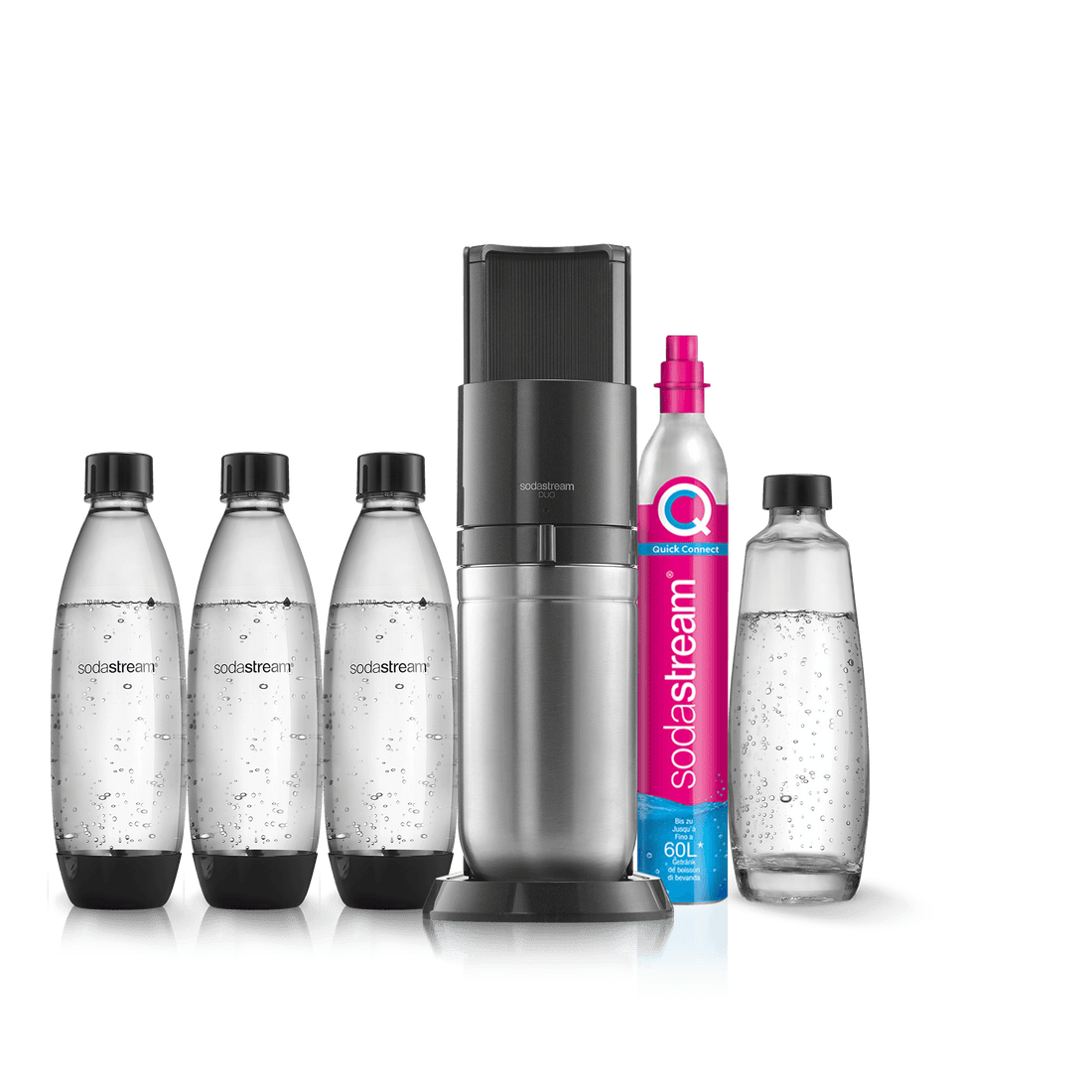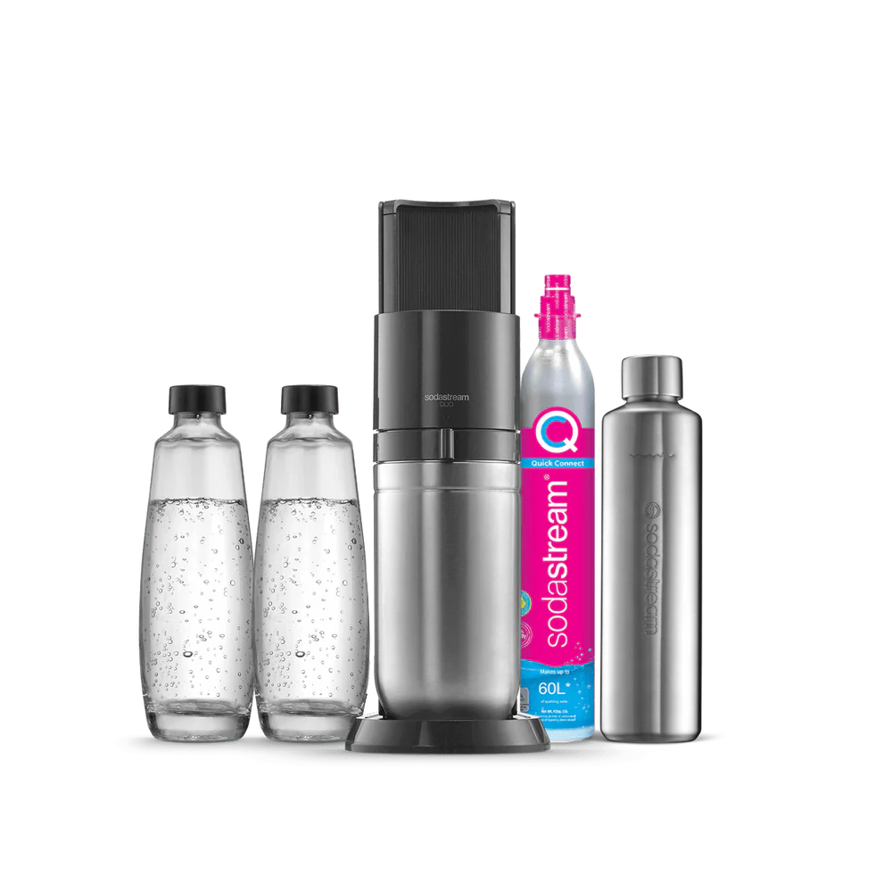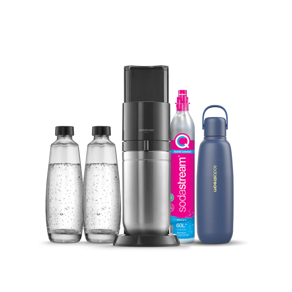 La machine à gazéifier SodaStream DUO™ peut s’utiliser avec notre carafe en verre de 1 litre compatible lave-vaisselle et notre bouteille modèle Fuse de 1 litre.