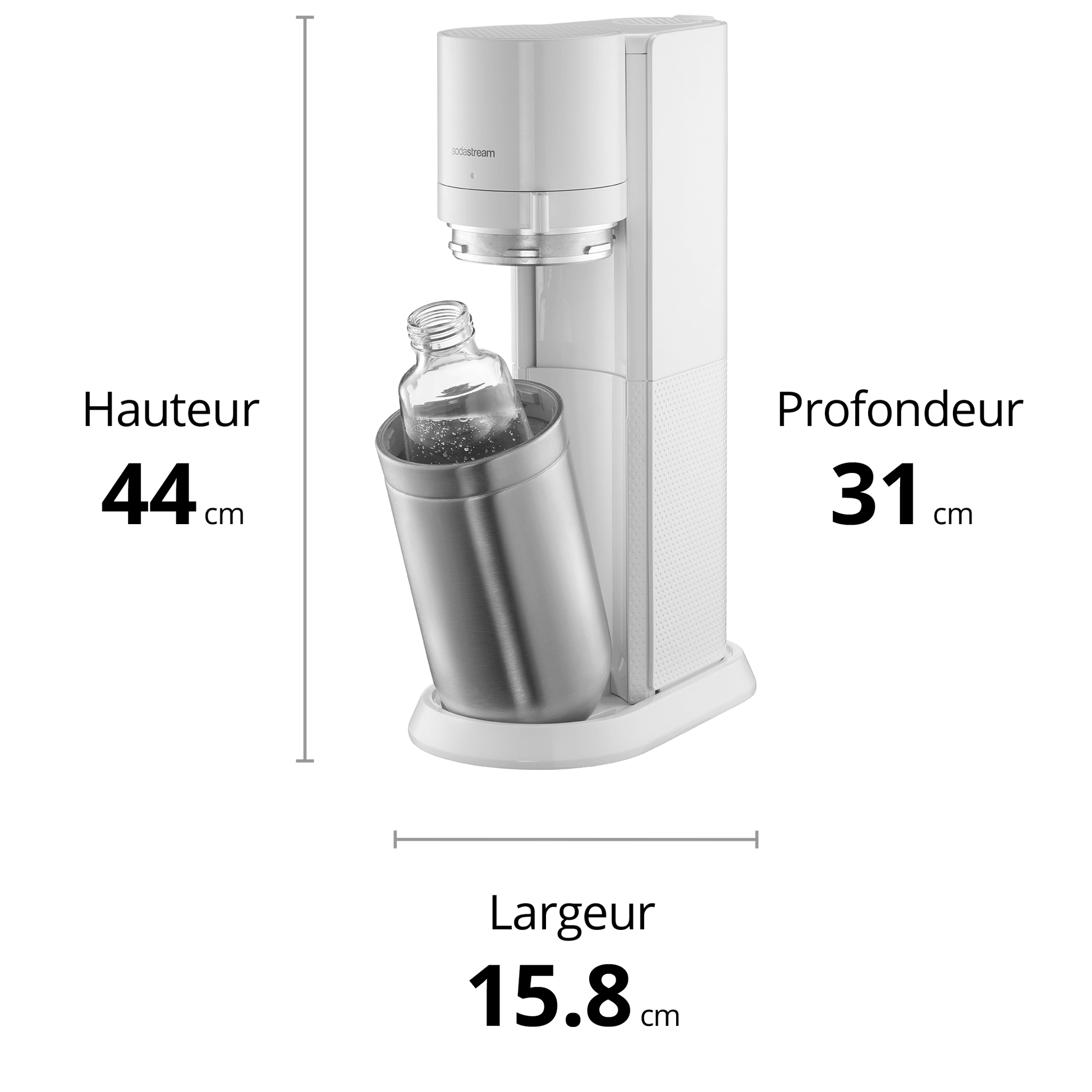 La bouteille modèle Classic de 1 litre, la carafe en verre de 0,7 litre (de la machine Crystal), la bouteille de 0,5 litre et le modèle My Only Bottle (0,5 litre) ne sont pas compatibles.