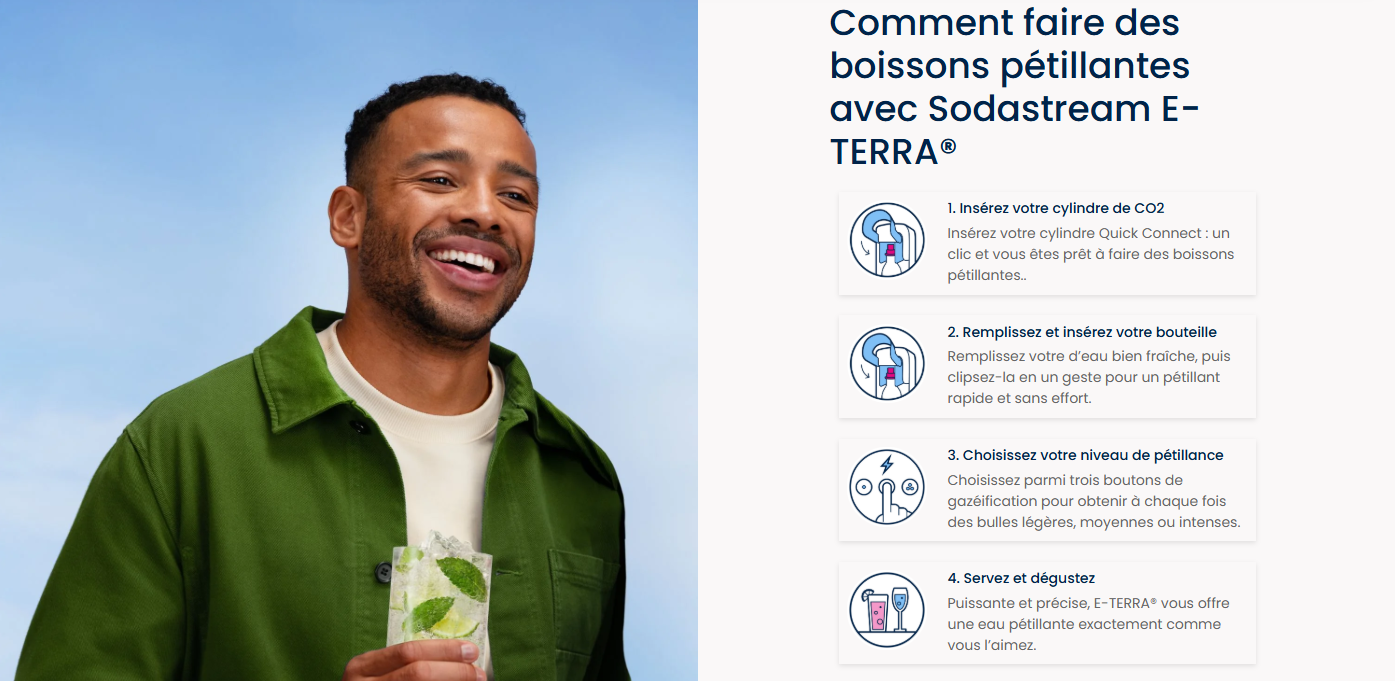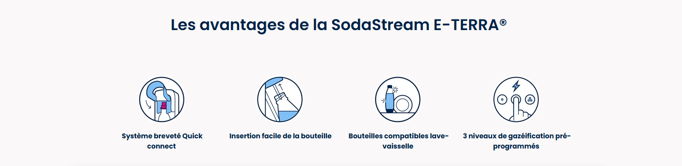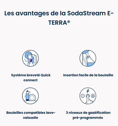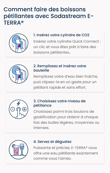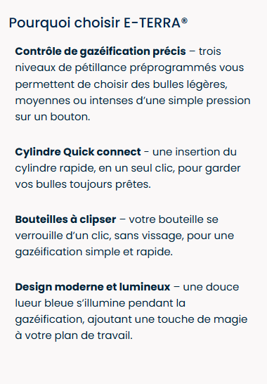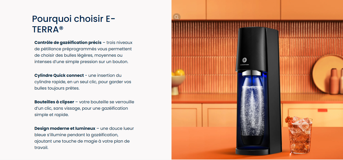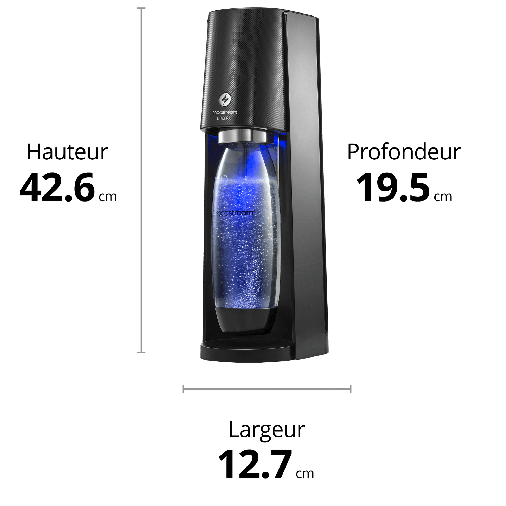La machine à eau pétillante électrique E-Terra offre l'expérience de gazéification parfaite en une simple pression. Son style contemporain et son animation LED vous plongent dans une atmosphère unique et résolument high-tech pendant la gazéification.