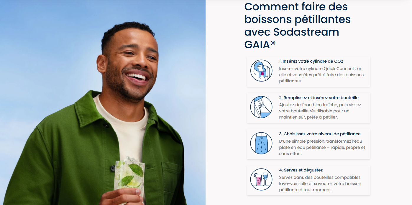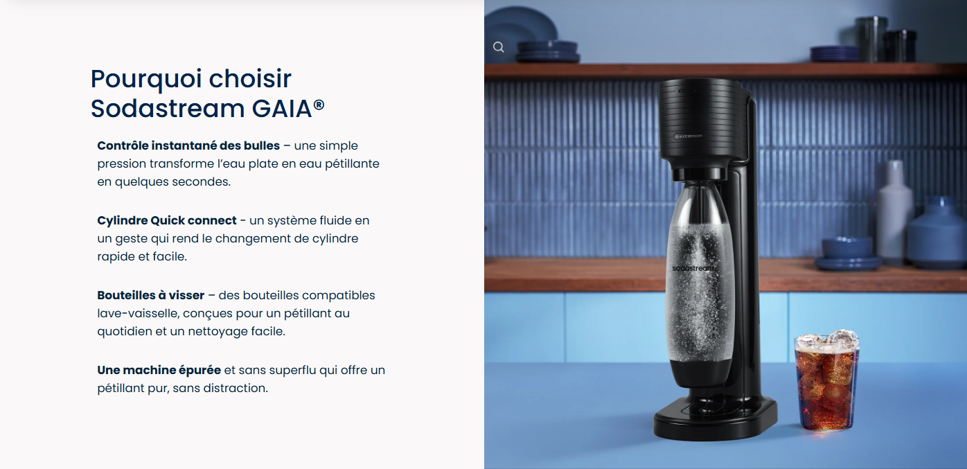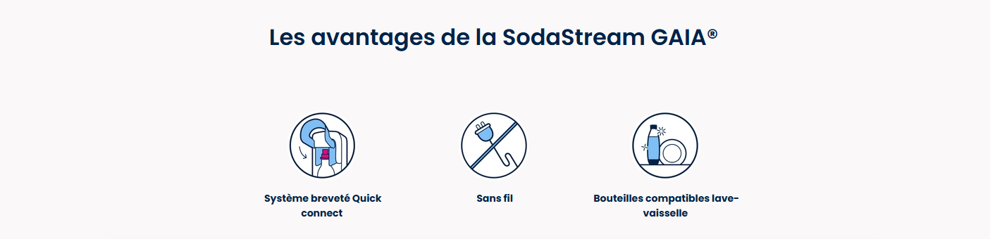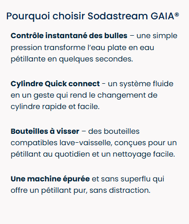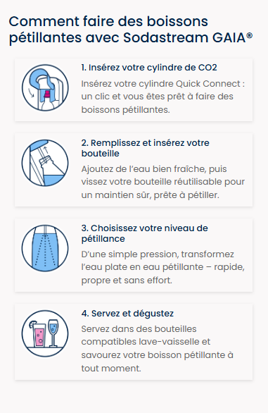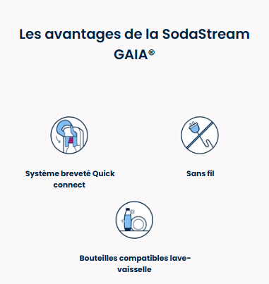Gaia, la machine SodaStream qui se concentre sur l'essentiel. Créez des boissons fraîches et pétillantes en une simple pression. Elle est dotée du système breveté Quick Connect pour une insertion simple et intuitive de la recharge de gaz.